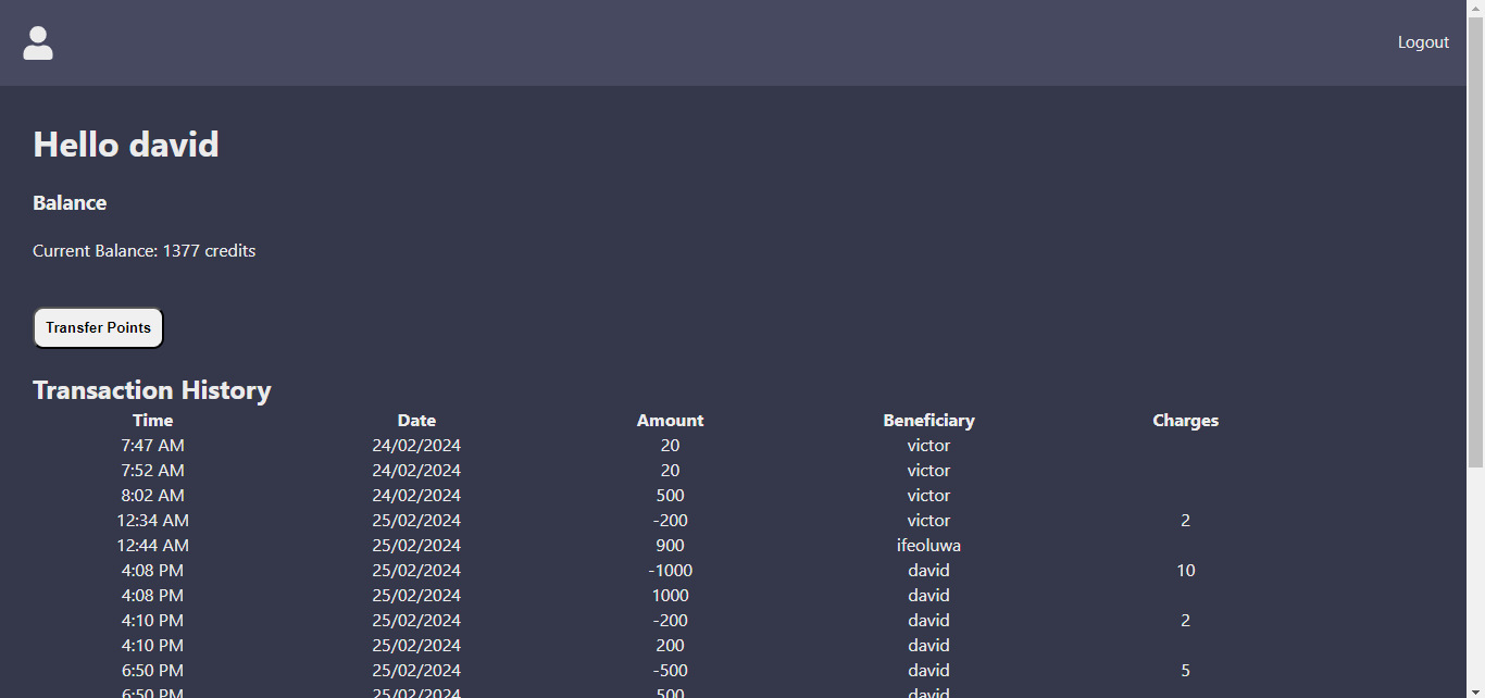 A point transfer application that enables authenticated users send and receive points to and from different users